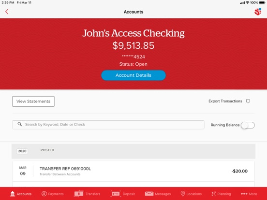 • Search for transactions by keyword, amount date, and check number