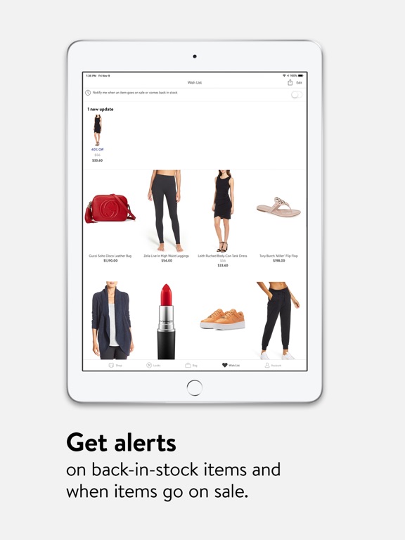 • Turn on notifications and we’ll let you know when an item comes back in stock or goes on sale from your Wish List, Shopping Cart or your Saved Items.
