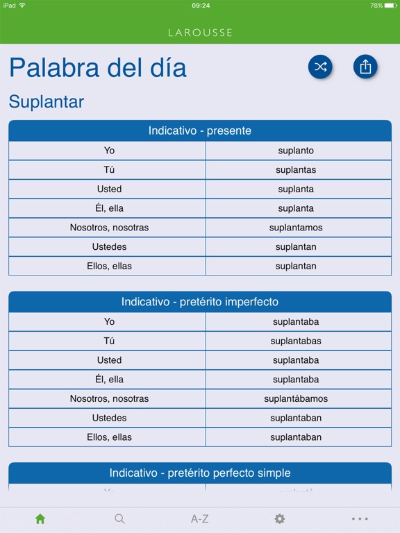 With Larousse Spanish Verb Conjugation Dictionary on your mobile device, you will have access to a wide range of modern vocabulary and interactive lexical entries that include definitions and verb conjugations. This application features 10 000 of the most commonly used verbs in Spanish. The app includes: