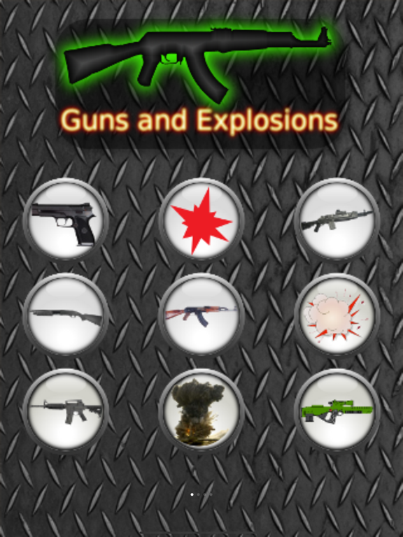 Guns and Explosions features free actual loud gun, explosion and rifle sounds at the press of a button. Simply press a button to trigger the loud gun, explosion and bomb sounds. Features realistic high quality gun, rifle and explosion sounds including: