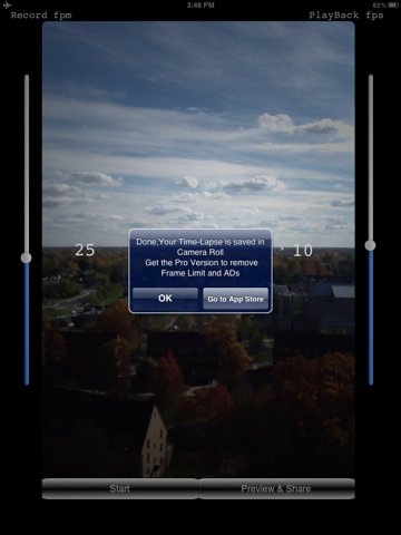 This app allows you to take Time-Lapse and stop action Videos. Record anywhere from 1 to 60 frames per minute. Play back at 1-30 fps. Also you can use this app to record stop-action film by simply taping the screen when you wish to take a frame. After you record your video you can access it in camera roll or Email the Video. Check out my website for some example Time-lapse videos taken with the app.