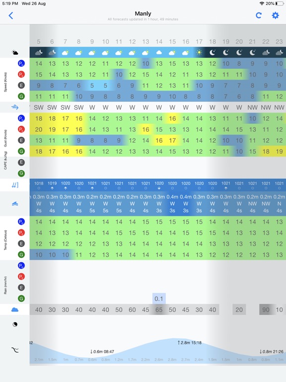 Easily navigate between wind, swell, rain, cloud, air and sea temperature forecasts in table, map and graph views.