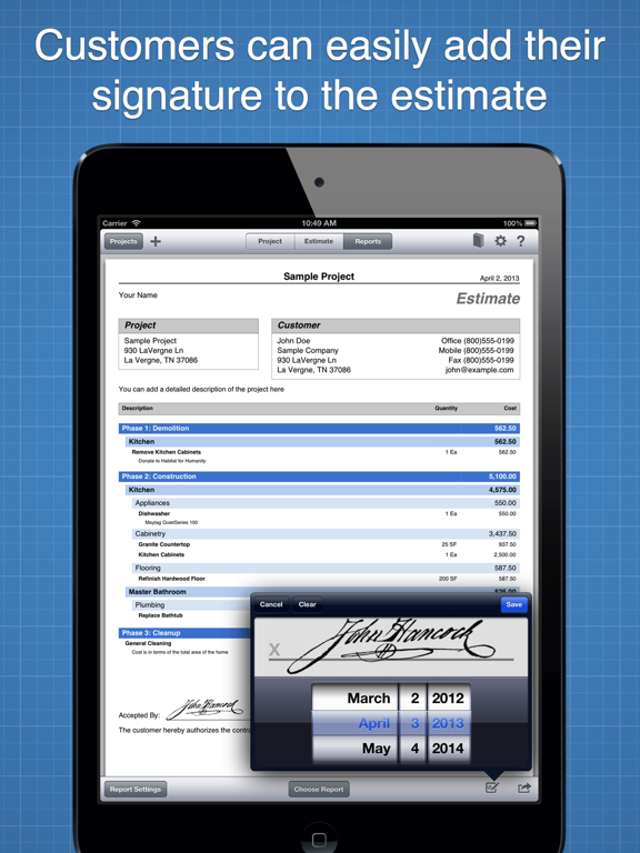 Construction Cost Estimator helps contractors and service companies quickly create on-site estimates for construction and repair projects. You can save time and money by creating the estimate on the spot and then emailing it to the customer as a PDF or printing a hardcopy.