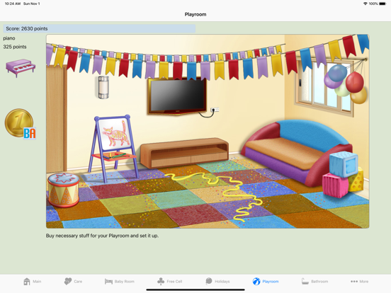 Another goal is to explore and purchase items for the Baby Room, Bathroom, Playground, Playroom, Family Room locations and purchase all the toys.