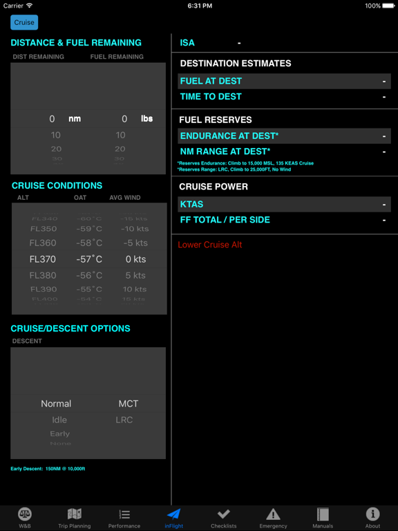 Climb & Cruise: Enter OAT, altitude, and weight and the app computes the Fuel Flow, KTAS, nm/100 lbs. for both MCT, LRC, and S/E LRC. No need to calculate the LRC FF manually. Trilinear interpolation yields numbers within 2-3 knots and 2-5 lbs/hr accuracy. Climb to altitude and Vy climb at altitude are also displayed.