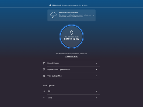 Atlantic City Electric’s free app allows you to easily access your account information on the go. The app makes it simple to manage more than one account at a time and is available to both residential and business customers on your smartphone or tablet. You can report your outage and stay up-to-date on the restoration status from anywhere. Key features include: