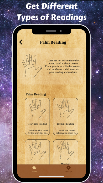 Know the future and hidden secrets about yourself and others with accurate palm readings and analysis. Read the Life line, Head line, Heart line, Success Line, Fate Line, Travel Line and Marriage line. Know more about love life, quality of life, health, personality, married life, etc. for your loved ones. Totally Free fun app. Be the center of attention in any party or in a group of friends by reading their palms.
