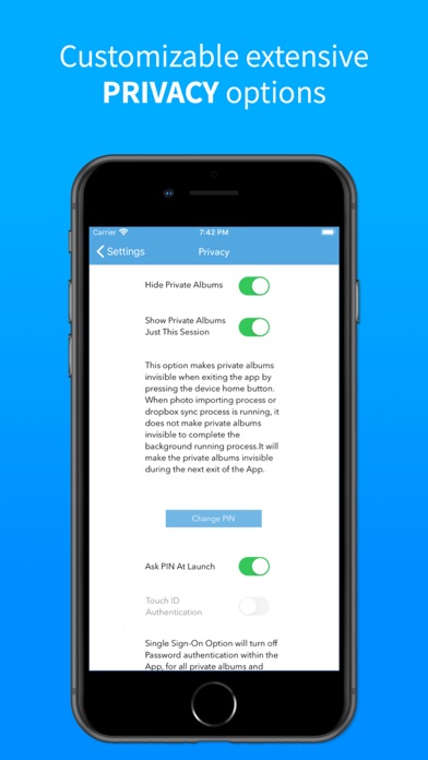 + Three levels of privacy settings, PIN at App launch, Password for private albums and make private albums invisible.