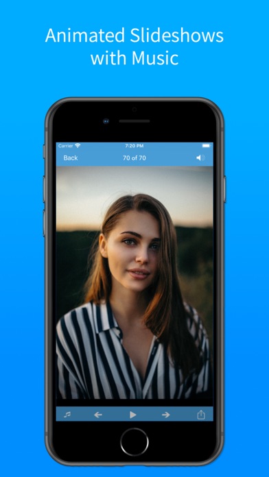 ▶ View photos with music in animated slideshow with 12 transition styles and effects.
