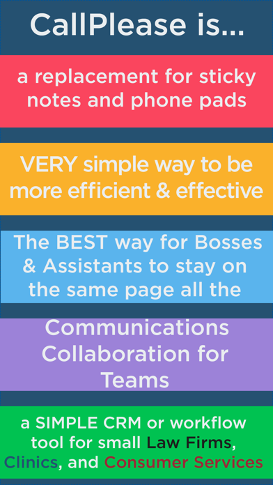 CallPlease helps you and your team be more productive anywhere you work. As a system for managing communications workflow, we have expanded on the traditional call logging system to enable instant access to one or more logs and address books and create customized workflows that help everyone know "What's Next." All information is tracked, synced and centrally managed among multiple users on all devices worldwide. CallPlease is the perfect mobile solution for anyone who wants to reduce communications chaos - individuals, executives + assistants, receptionists, teams, entire offices.
