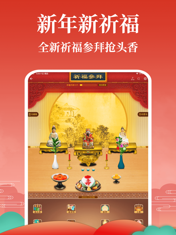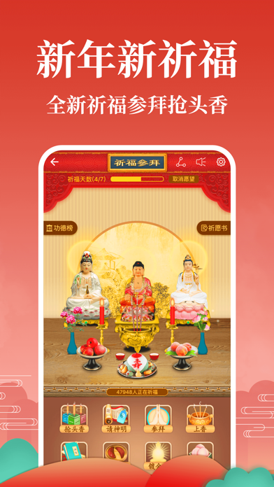 • 祈福参拜:此功能中有大家熟知的众多神明,可供信众们进行参拜祈愿,信众可以供奉无限神位。