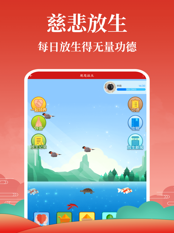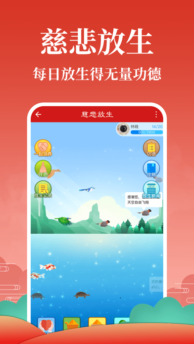 • 慈悲放生:放生可积德行善,您可以在我们应用中进行虚拟喂养放生,当达到一定的功德分后我们将以您的名义进行真实放生,并聘请大师为放生的生灵祈福。