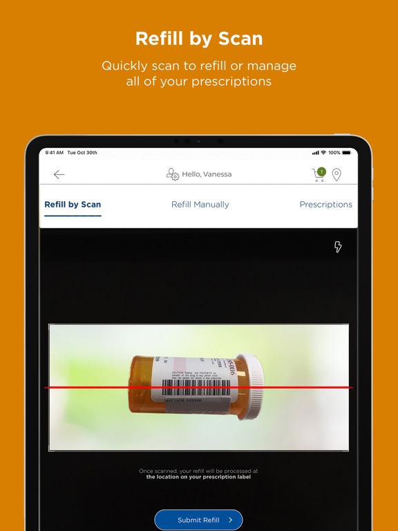 • You can manage your prescriptions, including the ability to refill from your prescription history by entering the prescription number or simply scanning the label on your bottle.
