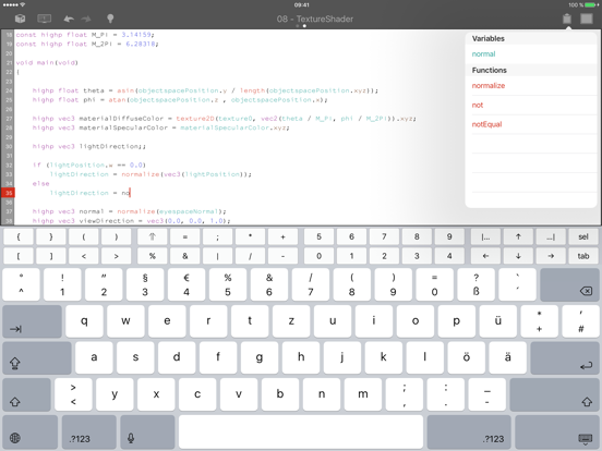 - Context-sensitive help for all GLSL keywords providing a description and usage examples (iPad)