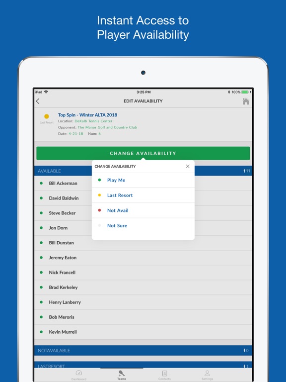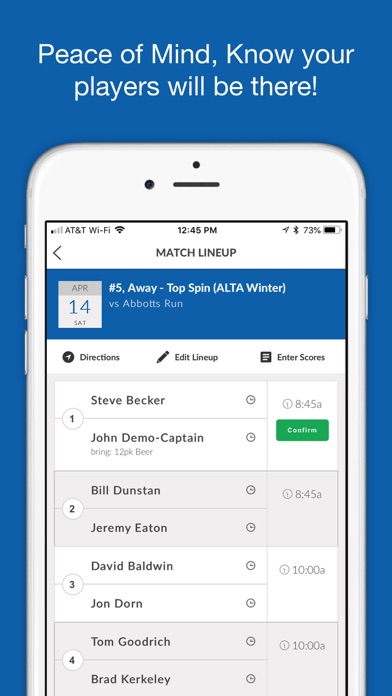 * Create/Edit Match Lineups - create your match lineup through the app quickly and easily. You can select who is playing which match line and also enter what each player should bring. Need to change the lineup, you can do that as well.