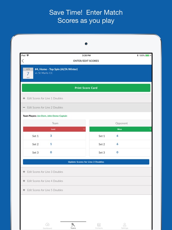 * Create/Edit Match Scores -- Want to keep track of the match scores while your team is playing... great you can enter the scores line by line one at at time.