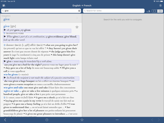 • Accessible right within the definition or translation - no navigating to a separate tool to conjugate verbs