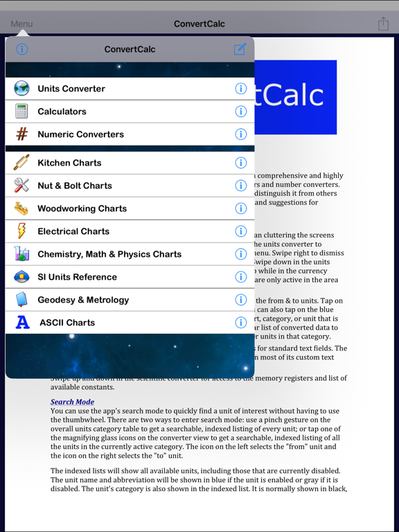 You can easily disable units & charts you don't need and put them in whatever order best suits you, then save it as a favorite and quickly switch between your favorites and the app defaults. There is also a powerful search feature to simplify locating a unit of interest, regardless of category.