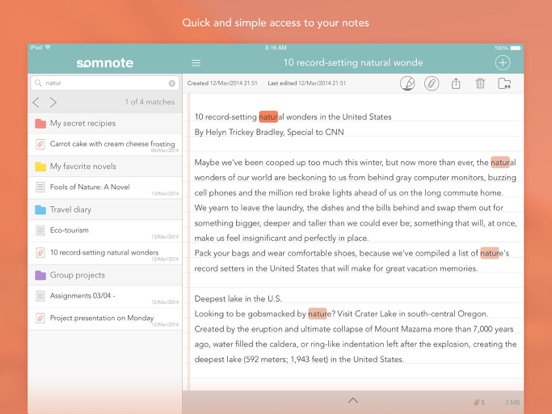 - Finding your note: You can find every note with the Search menu. It will instantly highlight every note and folder simultaneously as you type what you want to find.