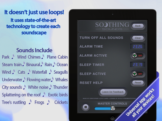 • Not just simple looping samples like other relaxation apps; contains state of the art technology to create soundscapes fully controllable by you.