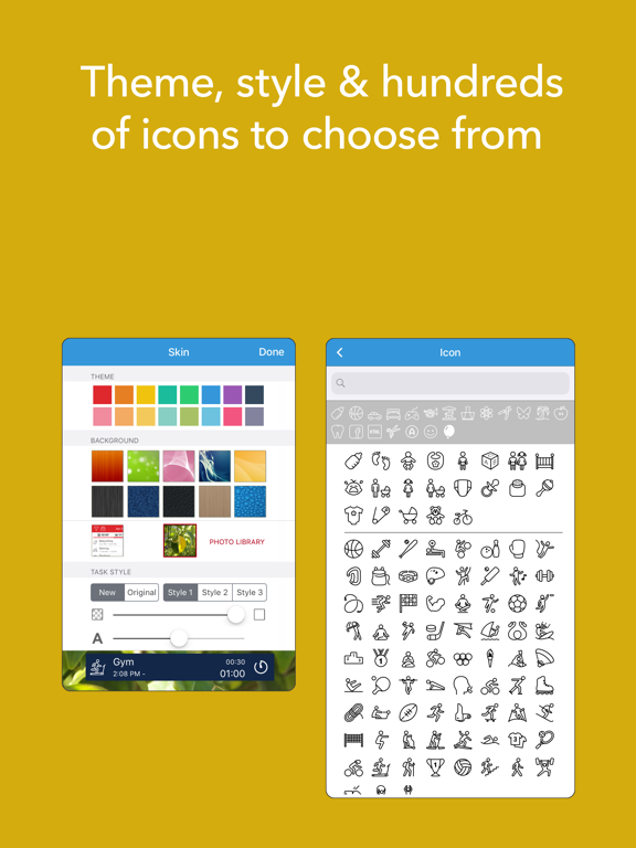 - Customization of activities with hundreds of icons to choose from. You can also color code the activities.
