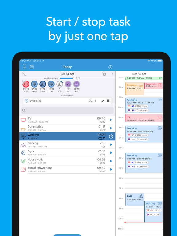 ATracker is a time tracking app that is very easy to use and requires minimal setup. It supports: one tap to start / stop time tracking; bar or pie charts showing where your time went; fully customizable user interface; categorize tasks with tags; data export as CSV and PDF; sync data between multiple devices; start/stop tracking via Apple Watch, Widget and Siri.