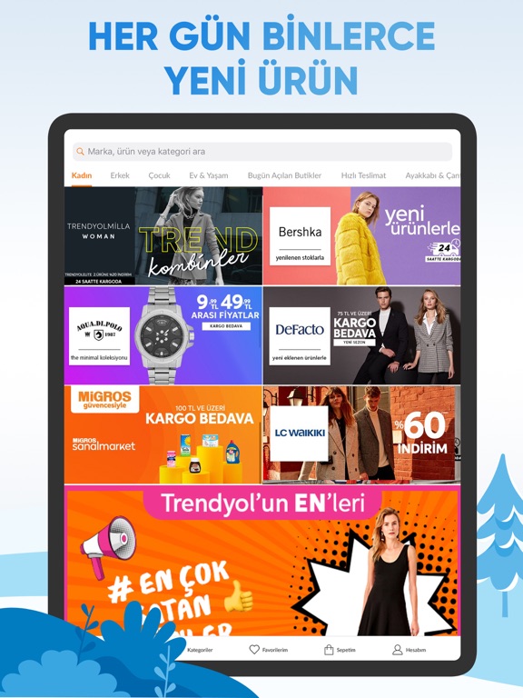 Download the Trendyol mobile app and do not miss the special discounts and promotion opportunities of your favorite brands such as Koton, Mango, Samsung, Adidas, Nike, Mavi, Pull & Bear, Bershka, Hotiç, HP, Sony, Oral-B, Microsoft, Siemens, Continental, Canon, Xiaomi, Oppo, Apple, iPhone, Huawei, Lipton, Barbie, Bellona, Prima, Converse, Levis, Vakko, Yargıcı, Casio, LG, Bosch, Arzum, Karaca, Tefal, Phillips, JBL, Baseus, Demirdöküm, Head & Shoulders, L'Oreal, Avon, MAC, Pubg, Blistex, Migros Sanal Market and Gucci!