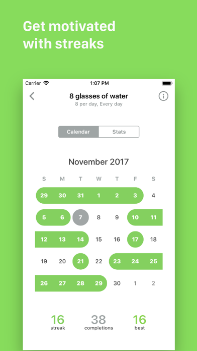Get motivated with streaks — Keeping streaks alive is a powerful motivator. See how high you can go, then try to beat your personal best. Red badges mean you've slacked and need to get back on track. Yellow badges show up after a streak ends, indicating it's time to recommit to building a new one. Gray badges are optional, missing them won’t break your streak. Green means go, complete it today!