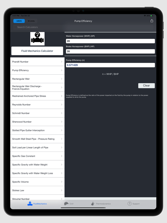 Fluid Mechanics Calculator contains 97 Calculators, to calculate different Fluid Mechanics, & Civil Engineering parameters. - Available in both USCS (Imperial Units) and SI (Metric Units)