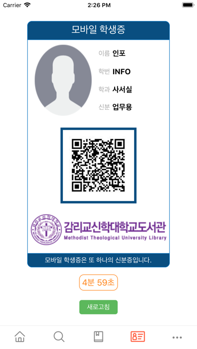 - 카메라: 도서 ISBN 바코드 인식 및 이용자 사진 정보 개인화 기능 제공