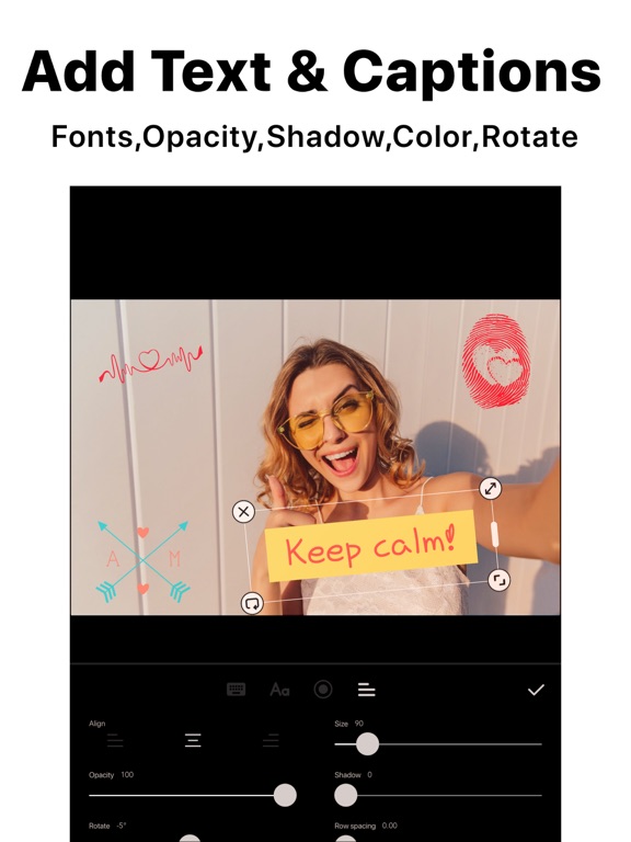 Add text to your photos, choose from tons of unique fonts. Change text color, size, opacity, background color etc.
