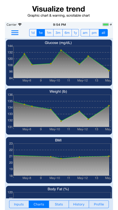Glucose Monitor turns your device into a personal glucose and weight monitor. It comes with lifetime data visualization, statistics reporting, email import/export, built-in reminders and much more. It can also be upgraded to track your blood pressure, weight, BMI, cholesterol, and more. This is an app with a lot of features.