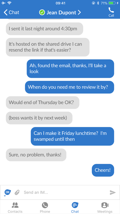 Chat on any device to others in your business, with messages synced across your devices so you can pick up the