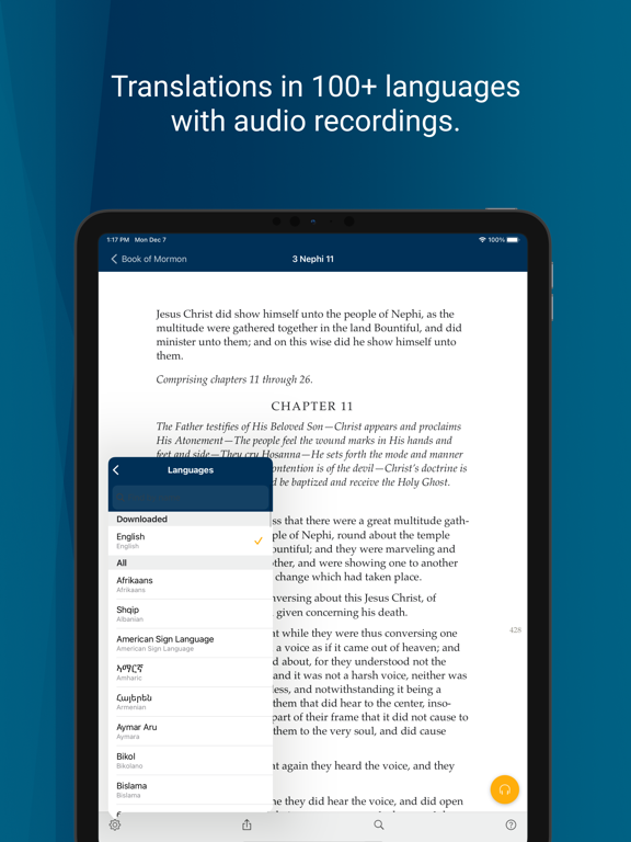 * Audio narration in Cakchiquel, English, Guarani, Japanese, Korean, Mam, Navajo, Portuguese, Quiche, Spanish, and Tzotzil