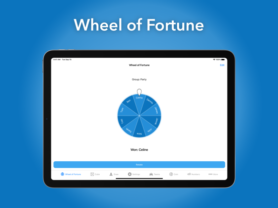 The random generator can do more than you think, try it out now for free. Features: - Wheel of Fortune - Dice - Flip coin - Random numbers - Generate passwords - Spin the bottle - Random letters and smileys - Random order - Draw - Random time - Table football teams - Yes or no - Draw teams - Counter