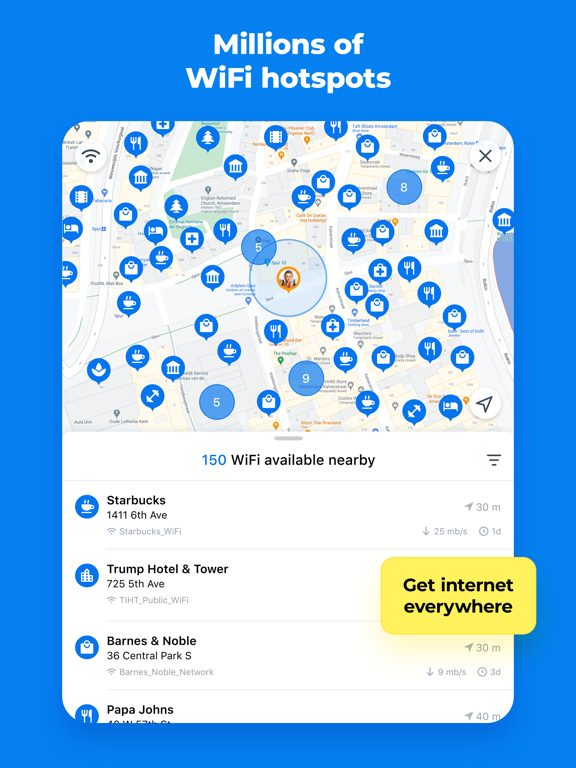 Always find a free WiFi hotspot around. WiFi Map TripBox will navigate you to the nearest shared hotspots, show passwords, and let you connect to the internet in a few taps.