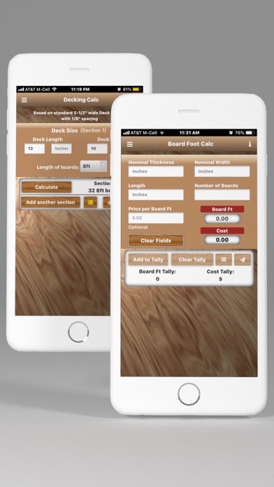 A board foot calculator that includes a Tally count and Tally cost. Using the Tally feature, you could enter varying sizes of wood stock in groups. For example, enter all 2x4's, add it to the Tally, then 2x6's, add it to the Tally, etc. You can basically use the Tally feature to estimate the cost of an entire woodworking project.