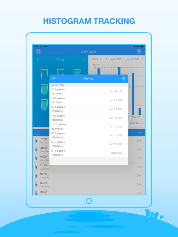 ⁃ Histogram to show the amount of your one day’s, recent one week’s and one month’s amount of drinking water.