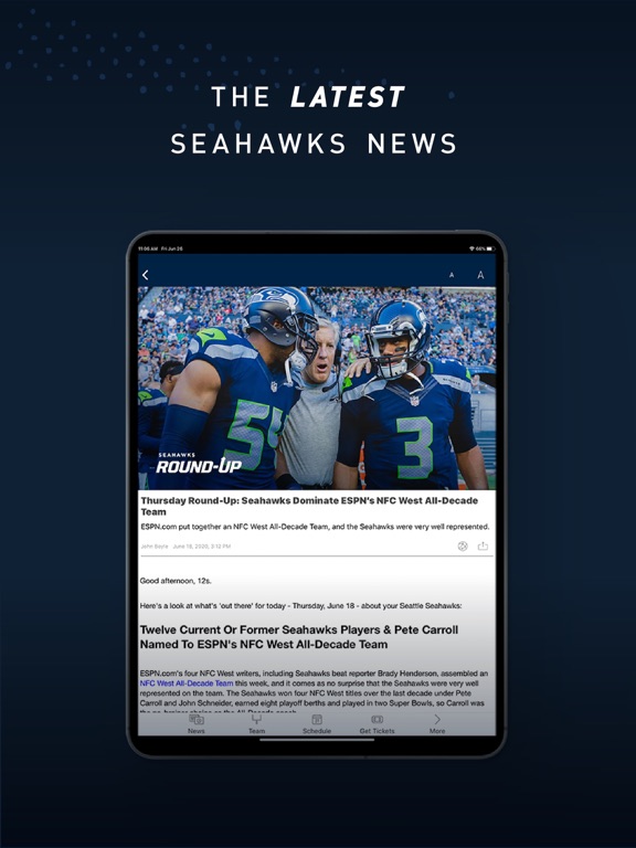 This is the official mobile app of the Seattle Seahawks. Use your iPhone, iPod Touch or iPad to stay connected with the team all year long. Team news, real-time statistics, video highlights, and more are available just a few taps away. Features include:
