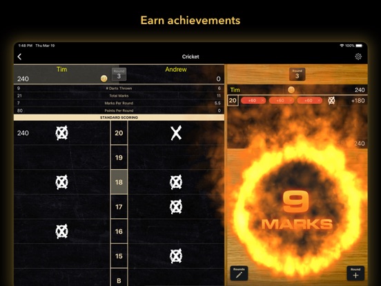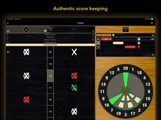 Score Cricket, x01 & Shanghai with up to 8 players or teams.