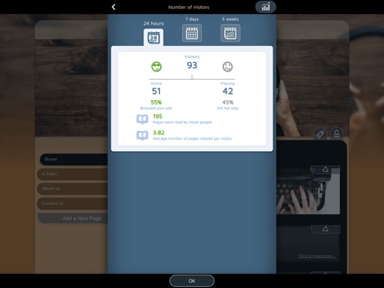 Up to 12 pages | 56 color presets | Enable and moderate your visitor’s blog comments | Control the way your site is shared on social media | Install and use Analytics | In-app hotline for direct contact with the SimDif team.