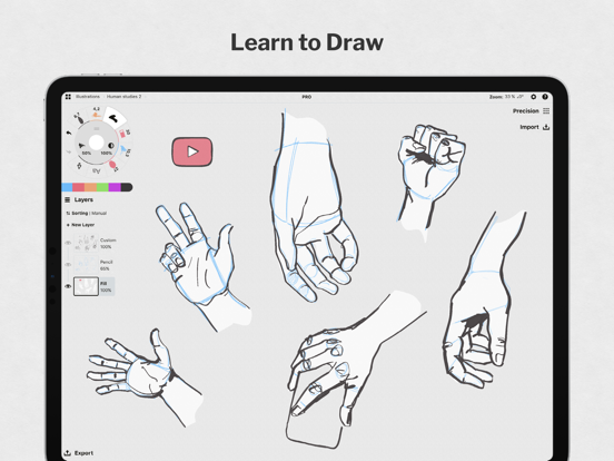 • dozens of realistic pens, pencils and brushes that flow with pressure, tilt and velocity, plus create your own for comfortable and flexible drawing
