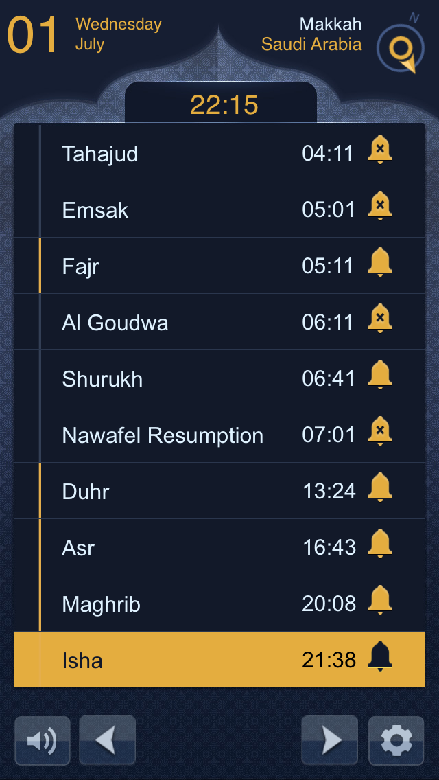 After the Athan, a graphic countdown will inform about the coming of the next prayer.