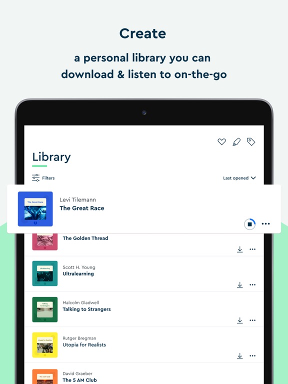 • Listen to audiobooks like "Sapiens", "The Art of War" or "The 5 AM Club"