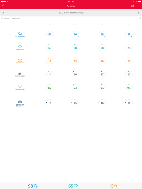 Oxygen Saturation (SpO2) - the oxygen level in the arterial blood to indicate changes due to heart or lung function, oxygen use by your body, or altitude