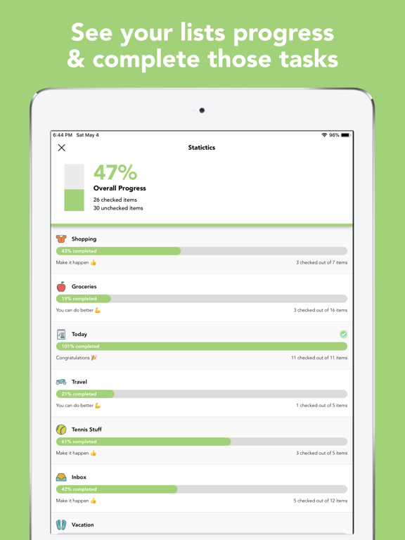 View the progress of all your lists combined, as well as each list individually. You have to check every last task to get that 100%!!!