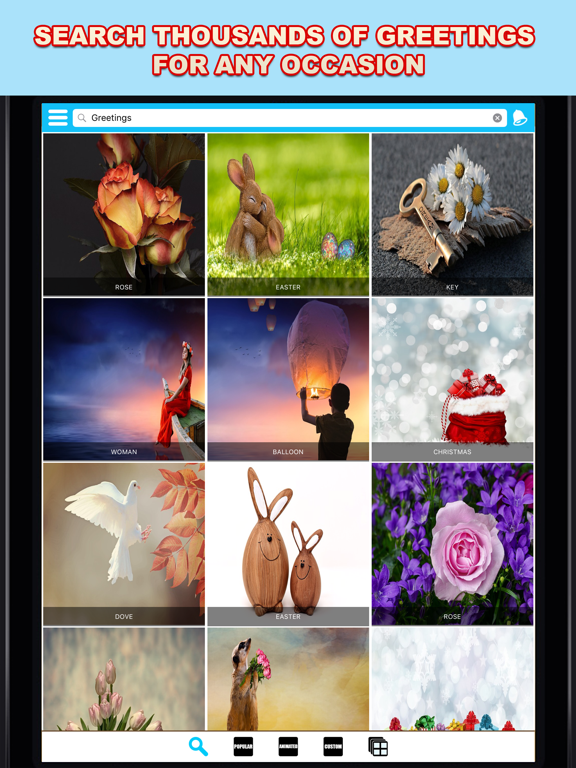 You name it we have it covered! All you need to do is download Greeting Cards App, head to the search tab and enter a topic and you will have hundreds of images to choose from your topic search.