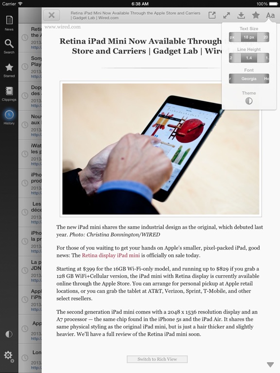 - Customizable gestures, full screen for iPad mini, multi-functional image viewer, history, star articles, are among the specific features for Apple mobile products.