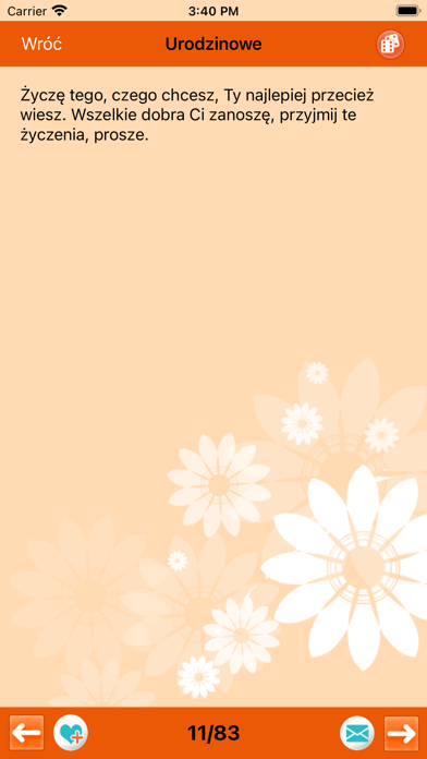 Teraz, gdy tylko potrzebujesz, w aplikacji znajdziesz setki gotowych życzeń na różne okazje, które możesz wysyłać do znajomych lub rodziny za pomocą SMSa lub e-maila. Dzięki naszej aplikacji zrobisz to wyjątkowo szybko i sprawnie.