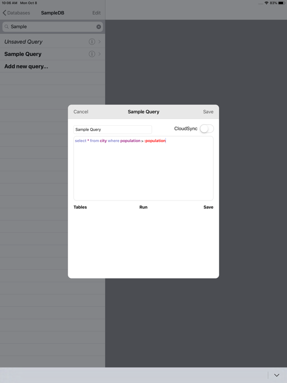 The fastest and most robust way to execute queries from your mobile device. QueryDB has spent over 8 years helping developers remotely query their MySQL databases on iOS. It's not just a desktop port: it handles flakey cellular network connections and delivering your data wherever you are!